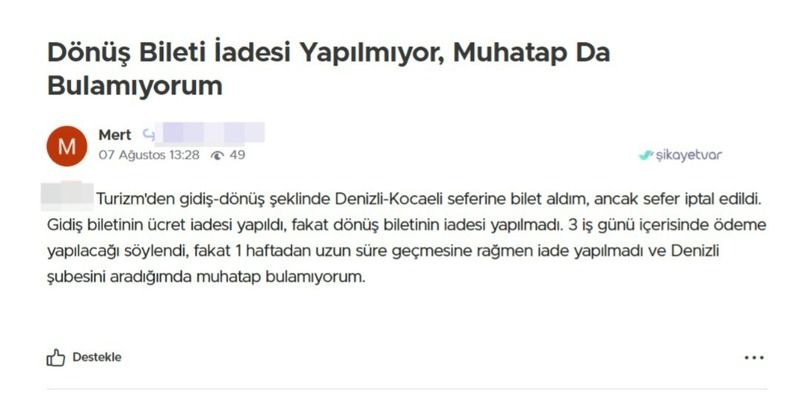 Şikayetvar.com sitesinde konuyla ilgili şikayetini paylaşan yolcu şunları söyledi: “M*** Turizm'den gidiş-dönüş şeklinde Denizli-Kocaeli seferine bilet aldım, ancak sefer iptal edildi. Gidiş biletinin ücret iadesi yapıldı, fakat dönüş biletinin iadesi yapılmadı. 3 iş günü içerisinde ödeme yapılacağı söylendi, fakat 1 haftadan uzun süre geçmesine rağmen iade yapılmadı ve Denizli şubesini aradığımda muhatap bulamıyorum.”