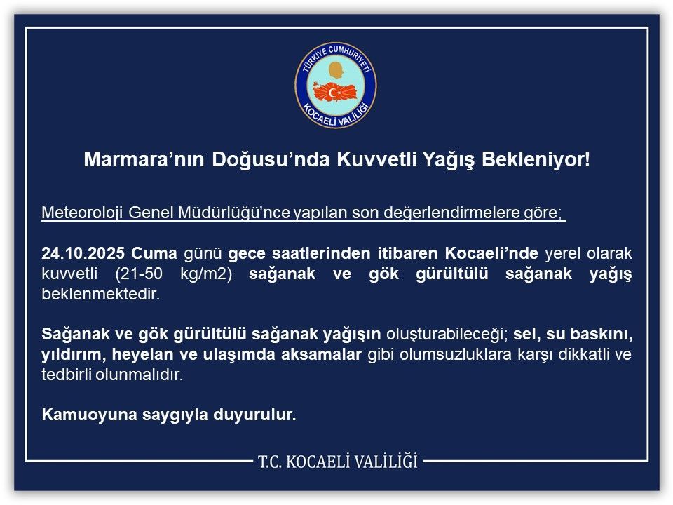 24.10.2025 Cuma günü gece saatlerinden itibaren Kocaeli’nde yerel olarak kuvvetli (21-