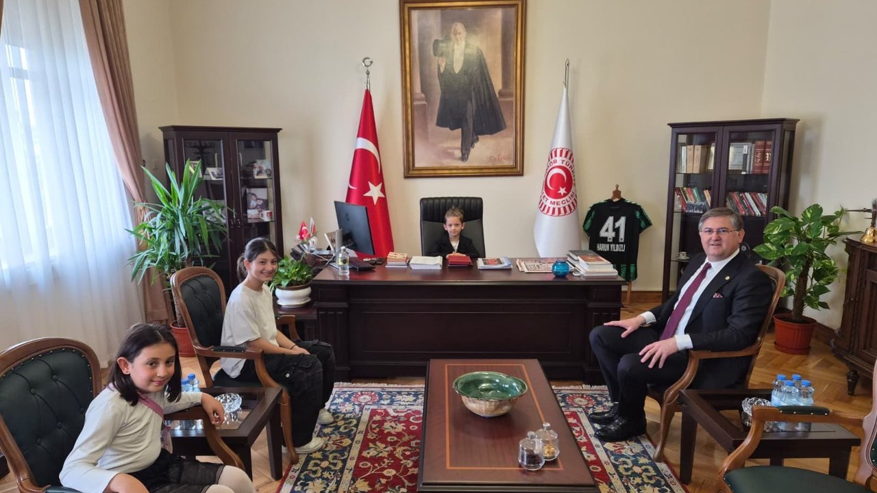 Yıldızlı'yı TBMM'deki makamına ziyarete gelen Melinda, Deniz Bilge ve Ali Atlas TBMM İdare Amirliği koltuğuna oturarak farklı bir deneyim yaşadılar.